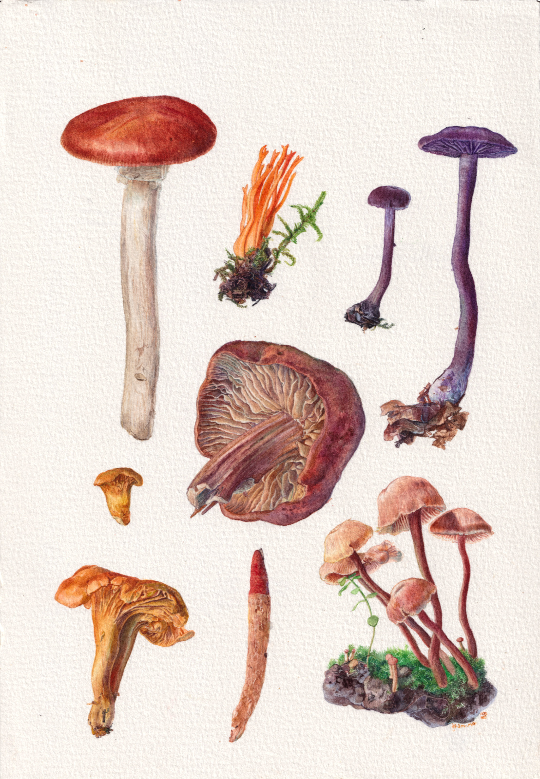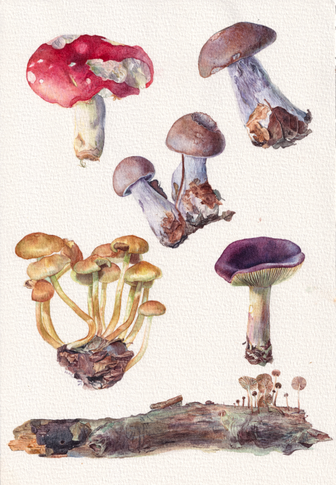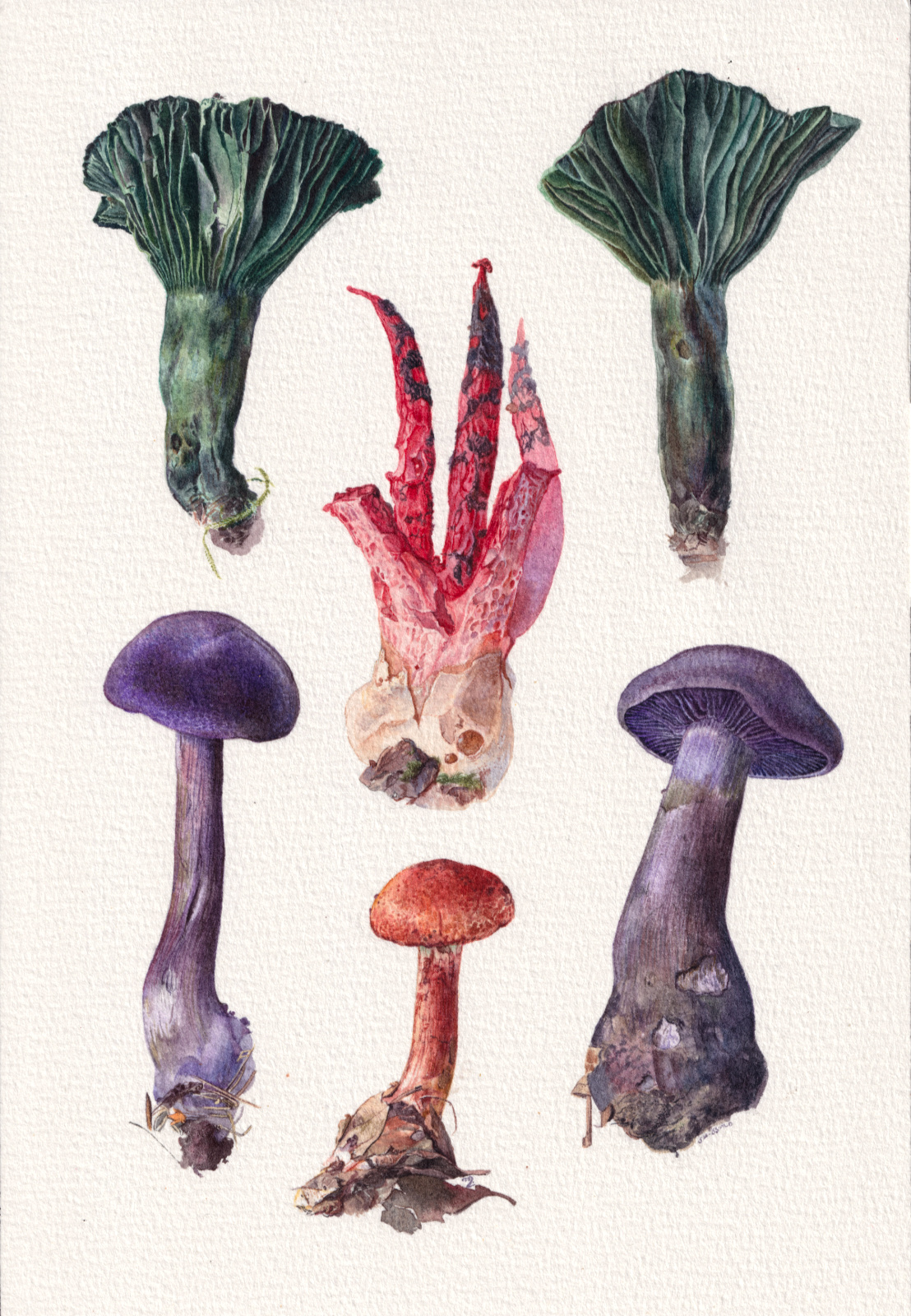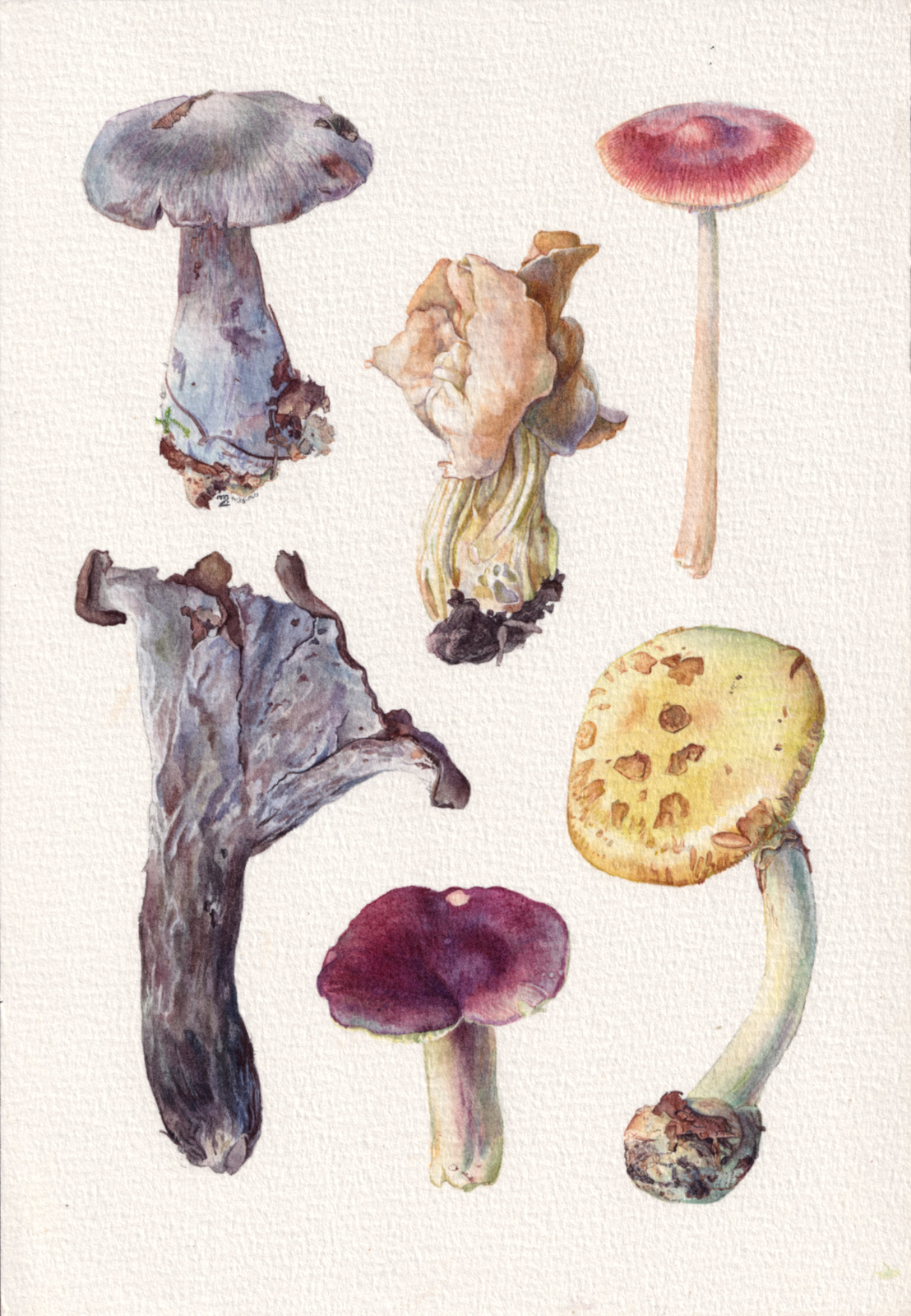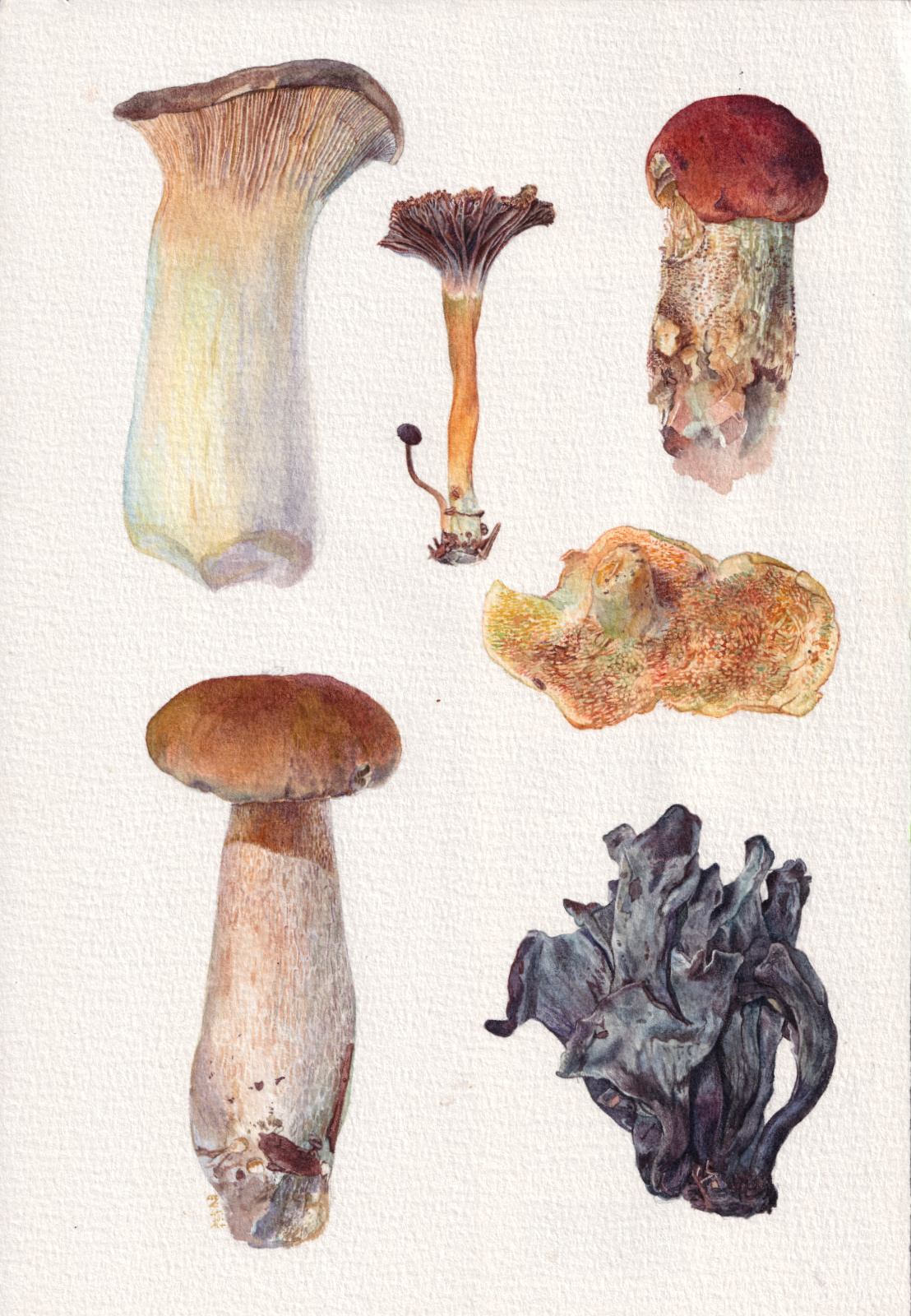 Fall/winter 2024 as a season of intense botanical studies in watercolour, as well as intense preparing and cooking and drying of their edible siblings! Spanning from September 6th, 2024, to January 16th, 2025, with an exception of a lone amanita from 2017 that patiently waited its hour for years in a corner, and a boletus edulis from the 2025 season to belatedly wrap up one of the paintings. In order: the warm study, the pale study, the sorceress study, the edible study, the agglomerate study. 18 x 26 cm.